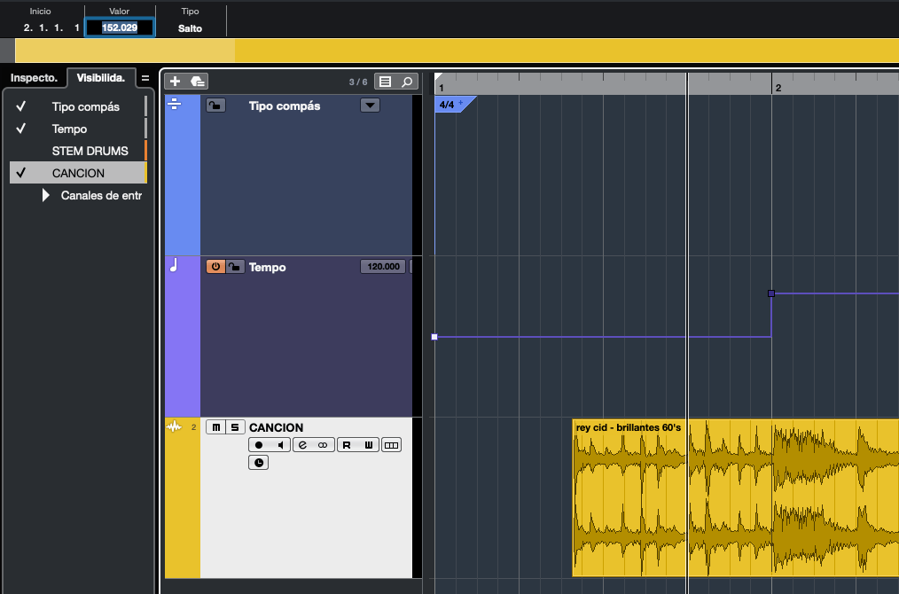- Luego sólo basta ajustar el punto insertado tanto en el valor correcto como en su posición temporal. En el ejemplo, el tempo calculado es de 152,03 BPM, por lo que es muy probable que en realidad sea simplemente 152 BPM y que haya sido la selección de rango la que tuviera un pequeño error. Entonces seleccionamos el punto insertado y en la línea de información y cambiamos su valor al correcto.