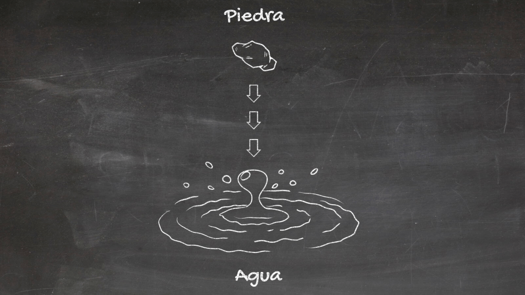 De forma similar, si dejamos caer una piedra en un estanque de agua quieta, esta produce una turbulencia que empuja las moléculas de agua con las que choca hacia abajo, pero como el agua es (al igual que el aire) un medio elástico y no se comprime tan fácilmente, estas moléculas que bajan empujan a sus vecinas hacia arriba. Y cuando estas moléculas que suben vuelven a caer, provocan sucesivamente el mismo efecto en sus vecinas, perdiendo una ligera cantidad de energía en el proceso. En el tiempo, este patrón de movimiento sube y baja se expande, alejándose de la turbulencia inicial en un movimiento circular concéntrico.
